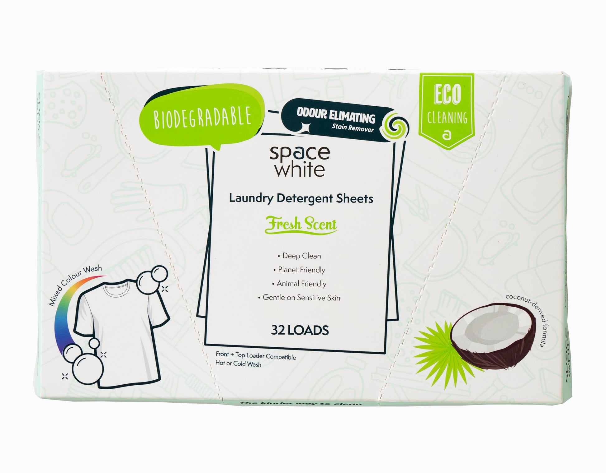 - 32 loads of laundry done using sustainable Space White laundry sheets